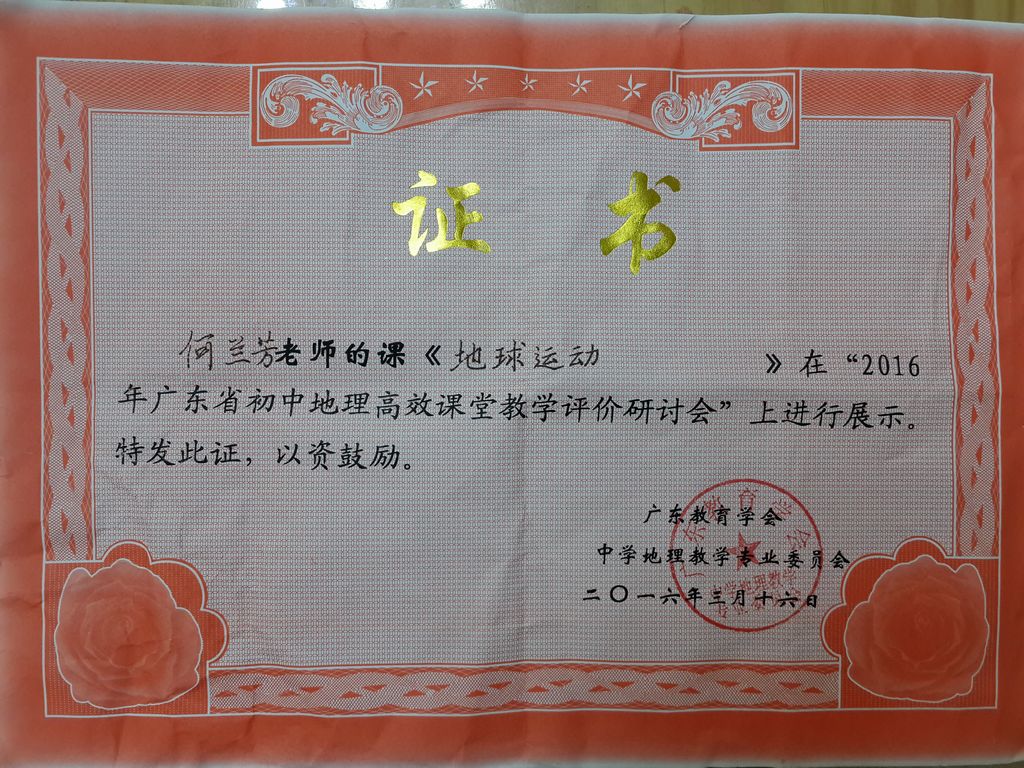 我校何兰芳老师代表湛江市参加2016年广东省初中地理毕业考试暨高效课堂教学评价研讨会