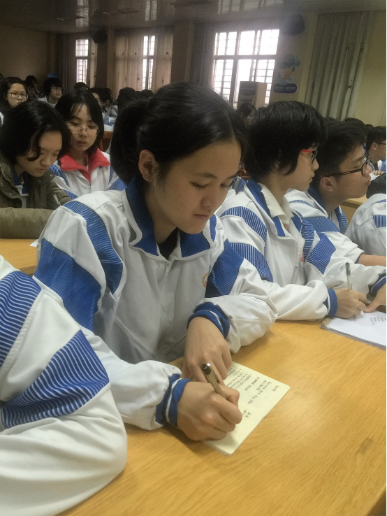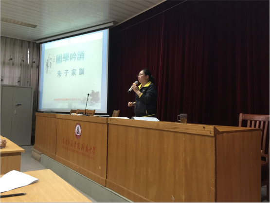 2016年3月17日周四傍晚18:20分至19:20分,这是雨溪文学社本周最后一次讲座,主讲人欧卓斌老师早早地来到教室同学生们沟通交流,互相了解这几天的学习情况和心得。为了给本周的讲座划上圆满的句号,教给学生一种新的读书方式,欧卓斌老师把吟诵贯穿于古诗文之中,既新颖独特,又简单实用,吸引了不少听众。欧老师以解读古代经典口袋书《朱子家训》为范本教授国学吟诵这一传统的读书方法,听众们不仅开始运用简单地吟诵方法来吟诵《朱子家训》,还明白了很多为人处世之道。这样一种修养心性的读书方法,不仅吸引不少学生,还让蔡婷婷、黄婷、陈茂、梁雨云、王思婷、陈宇智、魏水娣、陈黎黎等一批年轻老师也兴致盎然地到来听讲学习。