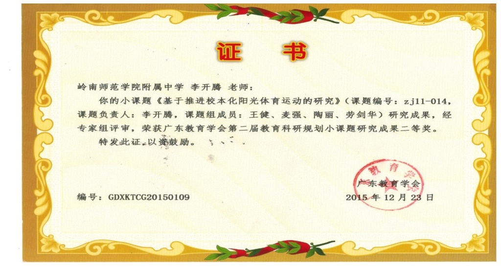 热烈祝贺李开腾老师荣获省级小课题研究成果二等奖 来源:教研中心 发布时间:2016-03-23 浏览次数: 次 【字体:小 大】 由广东教育学会举办的第二届教育科研规划小课题研究成果交流会于2016年3月20日在广州市第六中学举行,来自全省各地的小课题研究学者和市、县(市、区)教育局教研室的领导近1000人出席了会议。 我校李开腾老师的小课题《基于推进校本化阳光体育运动的研究》(课题编号:ZJ11-014)经过课题组历时两年精心组织,认真研究,取得了丰硕的成果,经省教育学会专家评审组严格综合评审,荣获二等奖。 分享到: 【打印正文】
