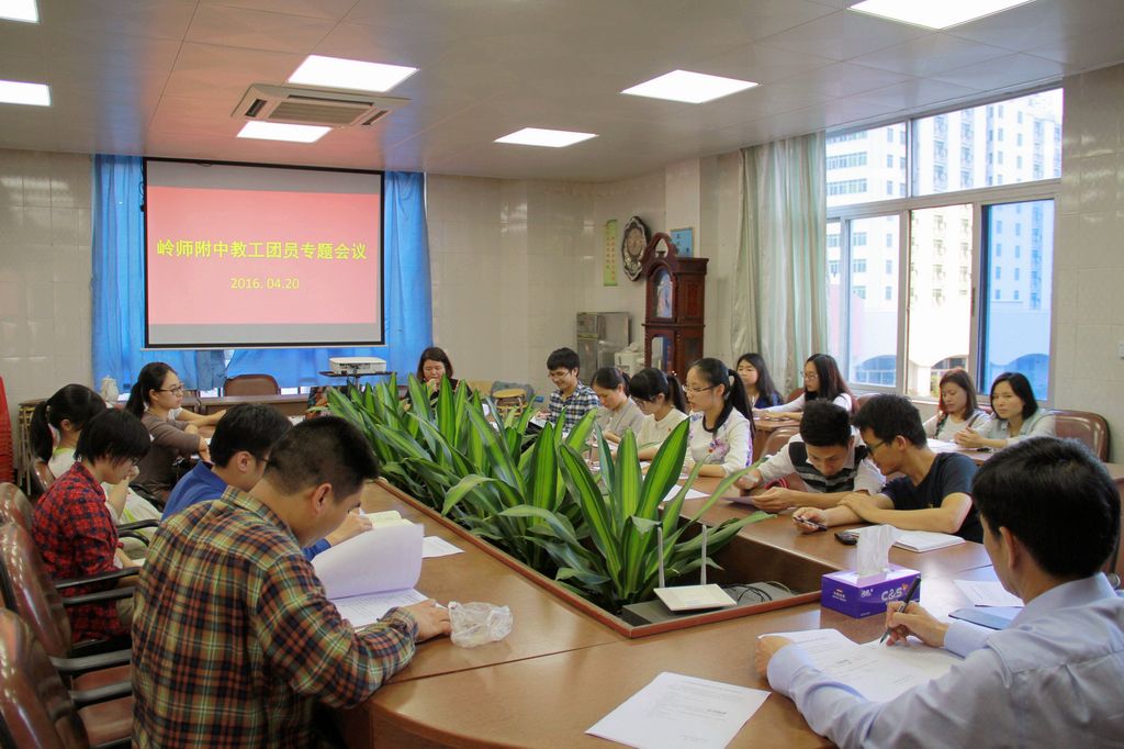 为进一步加强和改进我校青年教工团组织的工作,增强共青团组织的战斗力和凝聚力,充分发挥青年教职工在学校教学、科研、学生教育管理中的生力军作用,在学校领导的大力支持下,4月20日下午,我校教工团员专题会议在二号楼七楼小会议室隆重召开。会议主要目的是完成教工团支部组织机构的换届和部署新的工作。学校党委书记陈圣德、团委书记李文送,岭南师院附中东方实验学校团委书记吴裕彬及23名青年团员教师参加了会议。