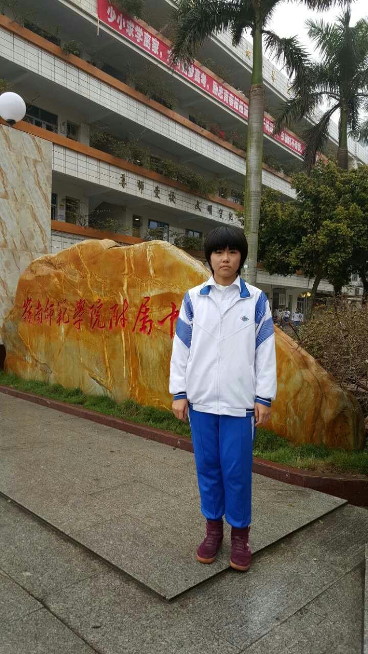 主要事迹:爱思考,爱创新,创新的人生更精彩!喜欢动手实践,喜欢接触新的事物,喜欢基于现有的事物上加以思考,从不同的角度去看同一个事物,用新的方式去解决问题。曾在2015湛江市青少年科技制作比赛获得一等奖、第31届湛江市青少年科技创新大赛获得一等奖。
