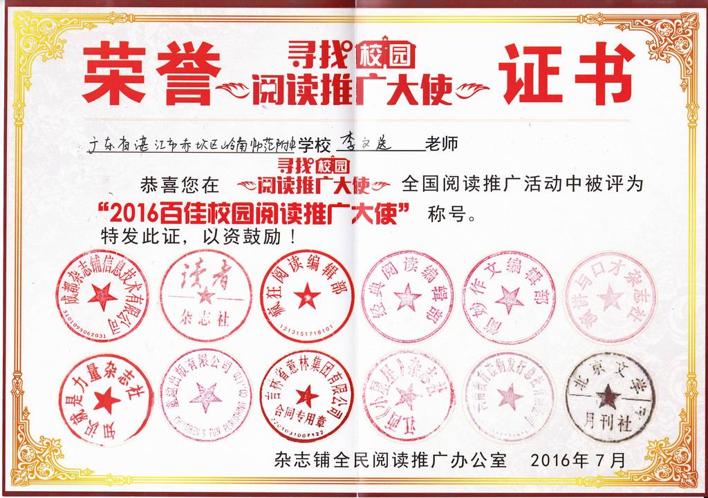喜讯:我校团委书记李文送被评为2016年“全国百佳校园阅读推广大使” 来源: 发布时间:2016-09-24 浏览次数: 次 【字体:小 大】 在2016年“寻找阅读推广大使”全国阅读推广活动中,我校团委书记李文送被杂志铺全民阅读推广办公室评为“全国百佳校园阅读推广大使”。 事迹链接:https://mp.weixin.qq.com/s?__biz=MzIxNzExOTY5Mw==&mid=2675478640&idx=3&sn=c753a31dae2621bade5384158a1a061d&scene=1&srcid=0909RBBghh36JcjZnr7Cxex6&key=1a6dc58b177dc6268c6396555c27b9a90e887dc32e6c4778a9ad335cd0142788bb076fd650b648e164e399d4abda2677&ascene=1&uin=MjAzMTMxMjAwNQ%3D%3D&devicetype=Windows-QQBrowser&version=61030004&pass_ticket=b72A%2B%2FEiuhvu8rN5XMSUqz8FCYgBrHDITjI4AKZ6E2sWMYqTE0fz8iWD5hIossWp 分享到: 【打印正文】
