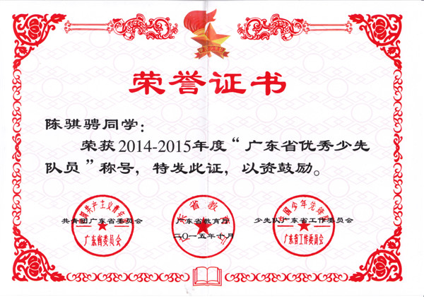 我校陈骐骋同学被评为“广东省优秀少先队员” 来源: 发布时间:2015-11-24 浏览次数: 次 【字体:小 大】 为在全省少先队组织中树立典型,榜样示范,不断增强少先队组织的吸引力、凝聚力和影响力,团省委、省教育厅、省少工委开展了2014-2015年度广东省少先队先进个人、集体的评选活动。根据《关于表彰2014-2015年度广东省少先队先进集体、个人的决定》(团粤联发〔2015〕71号),我校陈骐骋同学被评为“广东省优秀少先队员”。 分享到: 【打印正文】