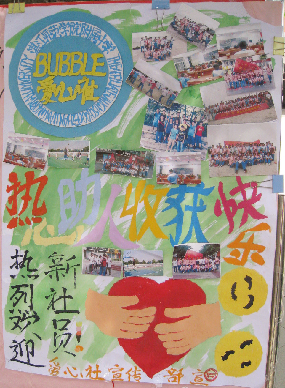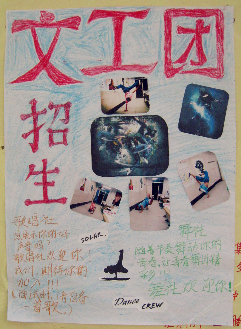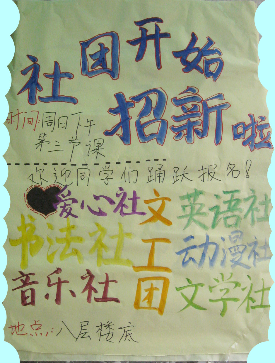 我校各社团即将进行火热招新 来源: 发布时间:2013-09-18 浏览次数: 次 【字体:小 大】 9月22日(星期日)下午,我校文学社、爱心社、书法社、音乐社、动漫社、文工团等社团将于学校八层楼底进行火热招新。社团,是凝聚有共同兴趣的人的地方,是培养学生特长和展示青春风采的乐园,是书写精彩校园生活的炫丽舞台,欢迎有兴趣的同学踊跃报名参加。 社团招新 爱心社 文工团 分享到: 【打印正文】