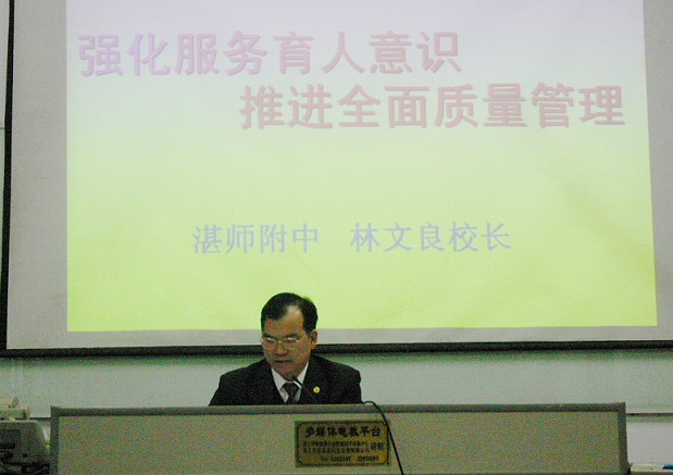最后,校长林文良以“树立服务育人意识 提高全面管理质量”为题作了总结发言。他指出,“树立服务育人意识,提高全面管理质量,办人民满意学校!”是我校今期工作要点中对老师们的倡导。综观各方面的要求表明:我们只有加强教师的服务意识,才能加强师德,为学生提供优质服务,才有可能把学校办成人民满意学校!他还认为,只有学校为教师、学生提供优质的服务;让教师与学校零距离、学生与教师零距离、教育与社会零距离,学校才有凝聚力,学校才有活力,学校才有发展力。学生有对学校教育服务提出要求的权利,学校有满足学生教育要求的义务。同时,他还指出,学校服务的目标是让学生、教师、社会零烦恼、零抱怨;学校的教育要实现“留给学生真诚——真诚到永远;留给学生发展 ——发展到终身!”。学校应提供以下服务:一是学校要树立为学生终身发展提供服务的意识;二是服务于学校的每一个教师的发展;三是学校还要关注教师职业压力,设法缓解教师繁重和超负荷的工作以及因学生施教难、竞争的激烈、不健全的教育管理机制等对教师造成的负面影响,至少要做到——力争让教师每天都有一个愉快的心情!